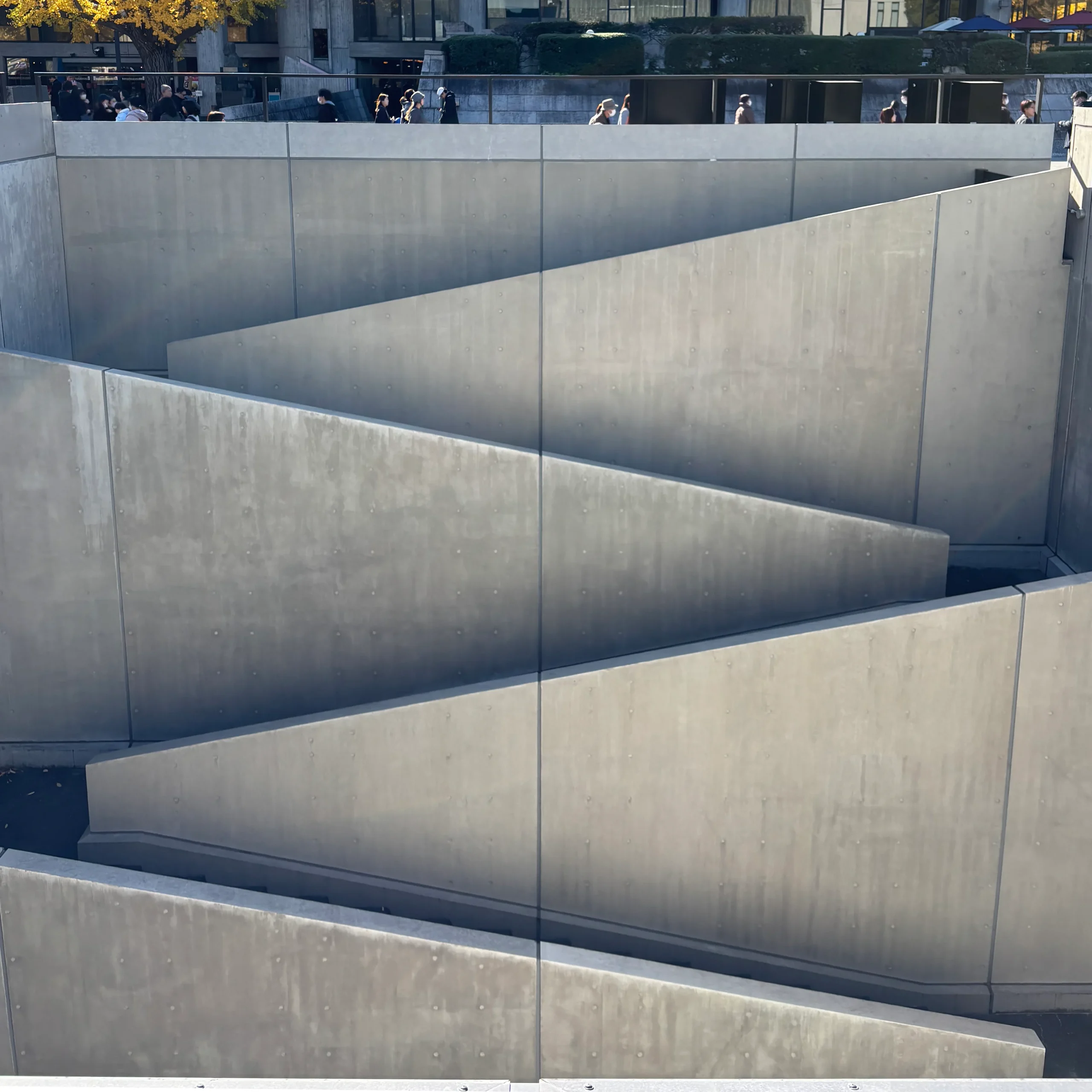 先日出かけてきた際に、不意に階段に目を取られて写真を取ってしまいました。コンクリート打ちっぱなしの階段ですが、どこかわからない地下へ続くことや、その大きさがとても魅力的に映りました。